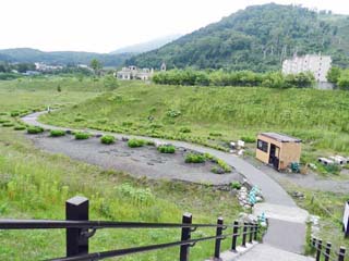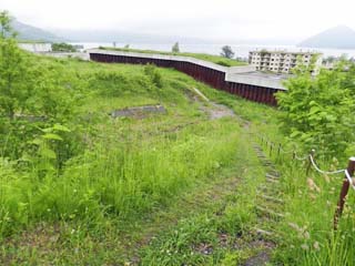 2013/6/22(7:33) 第2展望台から見る「やすらぎの家」と「桜ヶ丘団地」。 散策路入口をスタートすると、すぐに「第2展望台」で ある。 「第2展望台」からは、この先歩く災害遺構の建物、 「やすらぎの家」と「桜ヶ丘団地」を見ることができる。 |