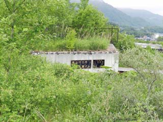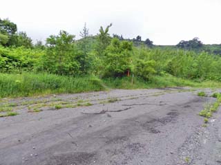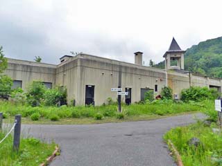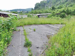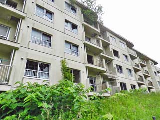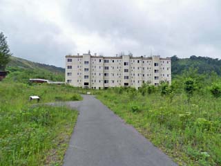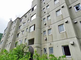 2013/6/22(7:46) 「桜ヶ丘団地」。 3棟あった公営住宅の内、この3号棟だけが遺構として 残されたという。 遠目には、今でも人が住んでいるかのように見える。 |