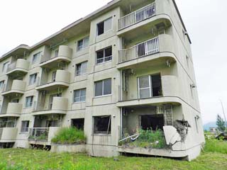 2013/6/22(7:51,7:52) 「桜ヶ丘団地」の表(玄関)側。 火口の反対側であり、割れている窓ガラスも少ない。 また、玄関側から見ると建物は、5階建てに見える。 写真をクリックすると「元桜ヶ丘団地と熱泥流の被害」の 案内板が表示されます。 この案内板は、960x960ピクセルあります。 案内板の文字を読みたいときには、表示された画像を クリックし、スクロールバーをご利用下さい。 |