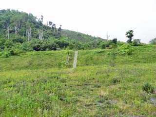 2013/6/22(8:00) 「桜ヶ丘団地」から「有くん火口」への道。 「金比羅火口災害遺構散策路」を離れ、「有くん火口」に 向かう。(標識「T-1’」) 写真中央の階段を登ったところには「T-2’」の標識が ある。 |