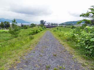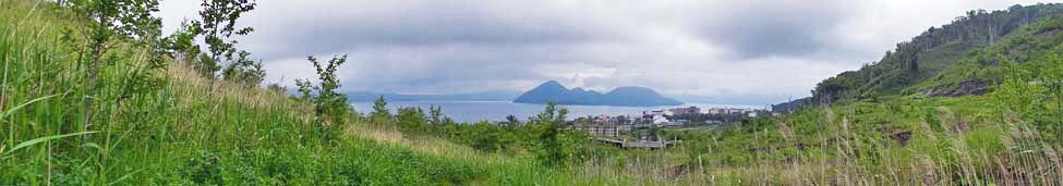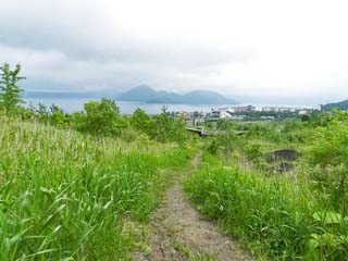 2013/6/22(8:18) 振り向いて見る「洞爺湖」と「桜ヶ丘団地」。 「旧国道230号」を離れると、雰囲気は一変。進行方向後ろには「洞爺湖」、その手前に「桜ヶ丘団地」等の災害遺構が見える。 なお、このページは、「金比羅火口災害遺構散策路(1/2)」からの続きです。 直接このページに入られた方は、「金比羅火口災害遺構散策路(1/2)」のページを先にご覧ください。 「金比羅火口災害遺構散策路(1/2)」のページへ |