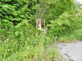 2013/6/22(8:42,8:45) 「旧国道230号」に残された「滑り止め用砂入れ」と「傾いたカーブミラー」。 |