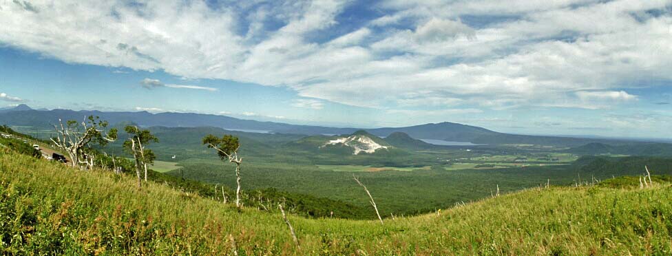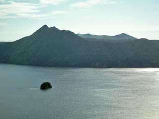 「硫黄山」の左右に写る湖が「屈斜路湖」。