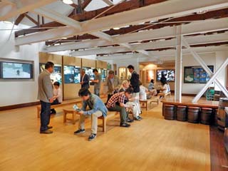 2013/6/18(14:47,14:49) ニッカウヰスキー「余市蒸溜所」の正門と見学者待合室。 ニッカウヰスキー「余市蒸溜所」は、JR函館本線「余市駅」を西に、徒歩で2~3分の場所である。 10名以上の団体等を除けば、特に予約をしなくても、入口で受付を済ませれば、工場内を見学することができる。 見学は、ガイドマップを見ながら自由に見学するか、ガイドの説明を聞きながら各施設を回るかを選択できる。 ガイド付きの場合は、30分間隔で行われており、所要時間は、約60分だが、ガイドの説明終了後も、 施設内を自由に見学することができる。 この日は、ガイド付きを選び、見学が始まるまでの時間を「見学者待合室」で過ごす。「見学者待合室」では、 映像やパネルなどで、ウイスキーの製造工程を紹介している。 左の写真をクリックすると拡大写真が表示(450x600)されます。 右の写真をクリックすると蒸溜所内の地図が表示されます。 この地図は、1280x960ピクセルあります。 地図の文字を読みたいときには、表示された画像をクリックし、スクロールバーをご利用下さい。 |