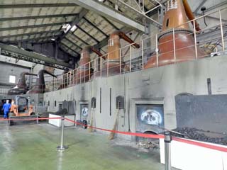 2013/6/18(15:05,15:08) 「蒸溜棟」と「ポットスチル」。 「蒸溜棟」の中に「ポットスチル」がある。 「ポットスチル」は、ウイスキーの蒸溜に使用する、「単式蒸溜釜」のことで、醗酵工程でできた「もろみ(醗酵液)」を この「釜」で2回加熱蒸発(初溜、再溜)させることにより、無色透明な「原酒」に変わる。 右の写真をクリックすると拡大写真が表示(600x450)されます。 |