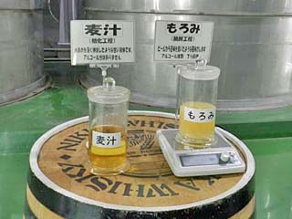 2013/6/18(15:13) 「麦汁」と「もろみ」。 「麦汁」は、水あめを薄く伸ばしたような甘い液体で、 アルコール分はない。 「もろみ」は、ビールから苦みを抜いたような風味で、 アルコール度数は、7%前後とある。 |