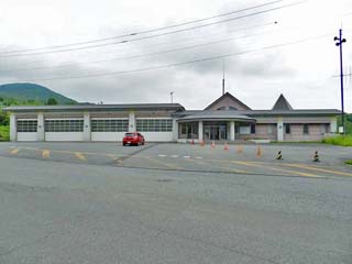 写真中央:元西胆振消防署。現在は「火山資料展示室」として利用されているが、床は地盤の隆起により4%傾いているという。