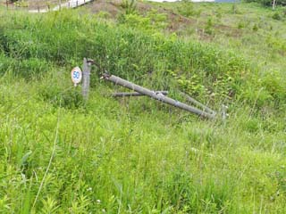 元町道「泉公園線」の折れた電柱と標識。 |