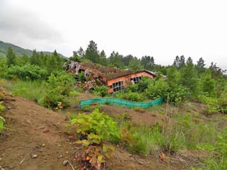 写真左:噴火による地盤の隆起により寸断された元国道230号線。左に写る建物は、元西胆振消防署。