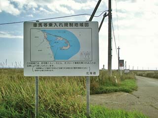 2011/9/10(13:12) この先で、「野付半島」は大きく右(地図では左)に曲がり、半島先端にある「アラハマワンド」へと続く。 「アラハマワンド」は潮干狩り場として知られ、歩いて行ける道もありそうだが、その距離は「野付崎灯台」から少なくとも数キロはありそうだ。 このため、「尾岱沼港」から季節限定で運行される観光船を利用するのが一般的のようである。 また、「アラハマワンド」の手前には、江戸時代から明治初期に栄えたといわれる港街「キラク」があったといわれるが、墓石が残るだけで、 文献や古地図上に記述がないため、その存在は謎とされ「幻の街」と呼ばれているという。 |