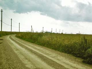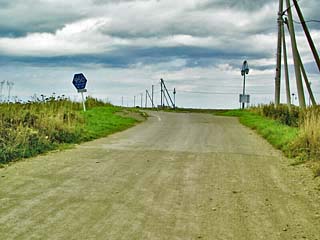2011/9/10(13:11) 「野付半島」の先端に向け伸びる道と電線。 先に建物が見えているが、漁業関係の建物 (民家を含む)であろうか、この先に町はないと 思うのだが、かなり遠くまで、ぽつりぽつりと 建つ建物が見えていた。 |