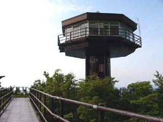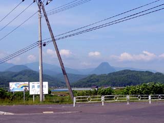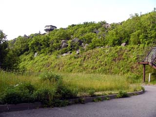 2010/6/29(15:51) 国道231号線を右に曲がり(標識あり)坂を 登ると、「雄冬岬展望台」の駐車場に到着。 写真は「駐車場」から見る「雄冬岬展望台」。 |