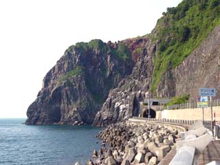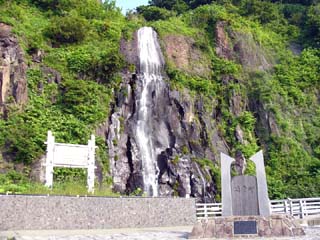 2010/6/29(15:42) 「白銀の滝」。 「雄冬岬トンネル」を北側に出た山側にある。 滝の右に写る石碑は、「国道開通記念」の碑。 「陸の孤島」といわれてきた、この地に20余年 の歳月をかけた難工事の末に国道が開通。住民百 年来の悲願達成とある。 |