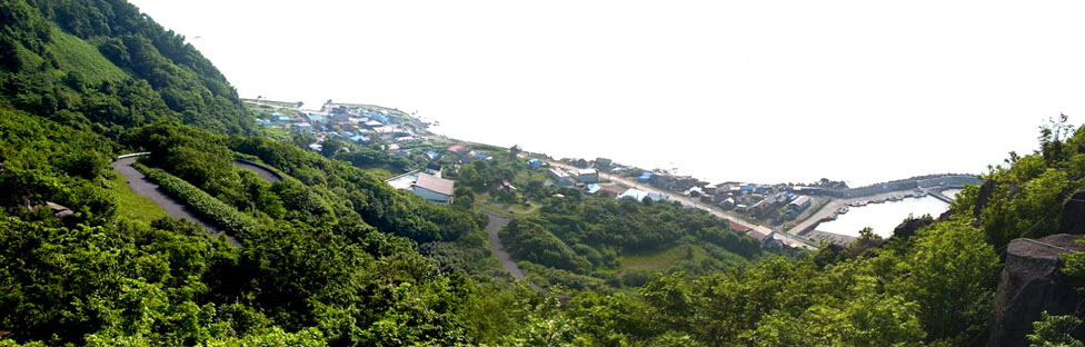 | 2010/6/29(15:59) 「展望台」横の階段から見下ろす「雄冬」の町。右に写るのが「雄冬漁港」。 この日は、残念ながら遠望が利かず「積丹半島」等を見ることはできなかった。 |