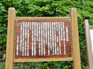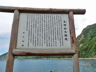 「太田神社 本殿」への登山口にある案内板。 「太田神社」は、北海道久遠群せたな町にあり、北海道本土で最も西に位置する神社である。