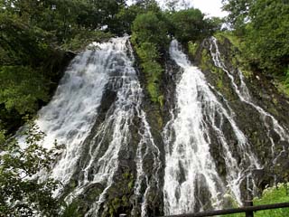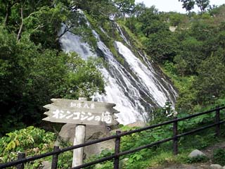 2011/9/8(15:13) 売店「オシンコシン館」の横を抜けると、 すぐ右に滝が見える。 手前に裏返しになったベンチは、記念撮影用で、 団体さんは、この場所で記念撮影を行うようだ。