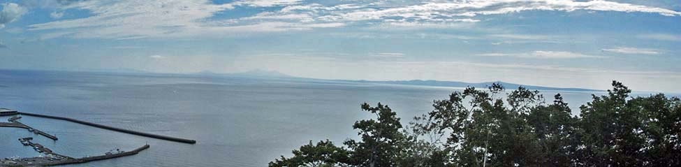 2011/9/10(8:36) 「羅臼国後展望塔」から見る「国後島」。 「国後島」の面積は、1,499k㎡あり、「沖縄本島」よりも大きい。 中央左に霞んで見える山が、「羅臼山:標高888m」。中央右に一番高く、木の葉と重なるように見える山が「泊山:標高543m」である。 左下に見えるのは「羅臼漁港」である。 |