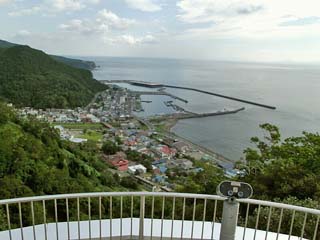 2011/9/10(8:39) 「羅臼国後展望塔」から見下ろす 「羅臼市街地」と「羅臼漁港」。 |
