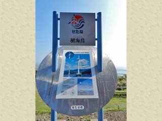 せたな町洋上風車「風海鳥」の案内板。 「瀬棚港」には、二基の洋上風車が立ち、これは海岸