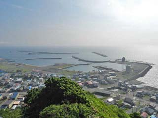 「屋上展望台」から見る「瀬棚港」。 港の奥には「蝋燭岩」が立つ。 写真をクリックすると「蝋燭岩」を中心に切り抜いた