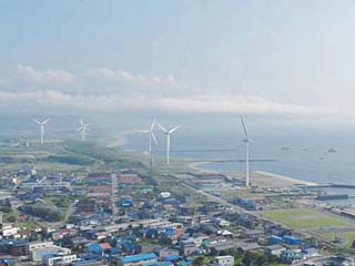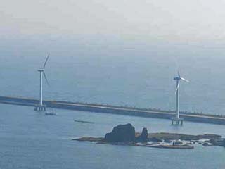左の写真は、電源開発株式会社が運営する「瀬棚臨海風力発電所」で、国内最大級(単機出力:2,000kw)の