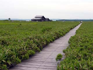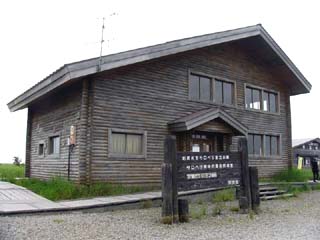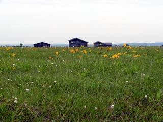 2010/6/30(8:57) 1週のほぼ半分を歩き、遊歩道の南側から見る。 写真左の建物が「レストハウス」。中央が「自然 教室」。手前は、「エゾカンゾウ」と「ワタスゲ」 の競演といった雰囲気である。 |
