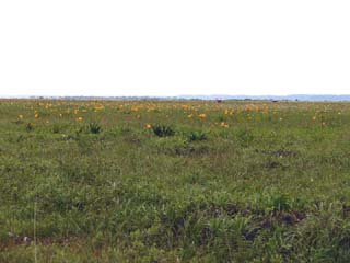 2010/6/30(8:43) この日「エゾカンゾウ」は、下サロベツより多く 咲いていた。「エゾカンゾウ」で原野が一面黄色 に染まるのは1年間のうち1週間程度と聞く。 また、6月に遅霜が降りると全滅する繊細な花で もある。 |