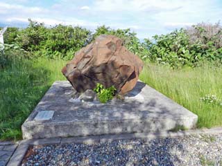 「青函遂道建設記念の碑」。 青函トンネル工事企業体の事務所や職員宿舎のあった場所に建てられ、碑の中央に開けられた穴は、