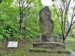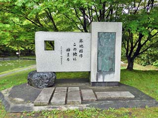 「寒地稲作発祥の地碑」。 「寒地稲作 この地に 始まる」と刻まれている。 |