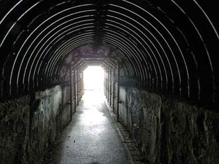 「島武意海岸トンネル」の中。 幅は、大人二人が横に並んで歩ける程度。長さは、写真で見るほどには長くなく、出口も見えている。