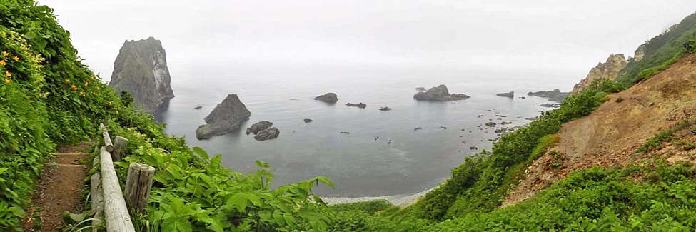 「島武意海岸」。 「島武意(しまむい)」の地名は、「岩の入り江」を意味するアイヌ語「シュマ・ムイ」に由来するという。