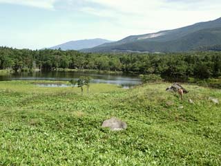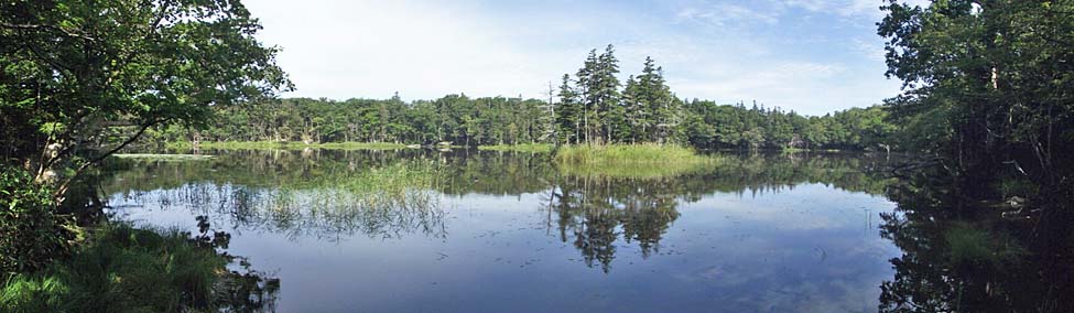 2011/9/9(10:02) 南側湖畔から見る「3湖」。 「知床五湖」の中で、湖の背後に「知床連山」が入らないのは、この「3湖」南側湖畔からの景色だけである。 |