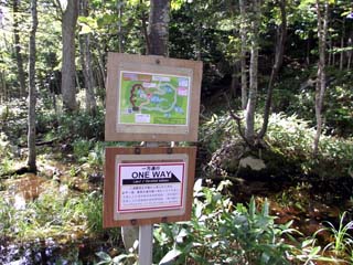 2011/9/9(10:11) 「2湖」の標識。 標高:239m、面積:5.3ha、 周囲:1.5km、水深:4.0mとある。 「知床五湖」の中では、一番大きい湖である。 |