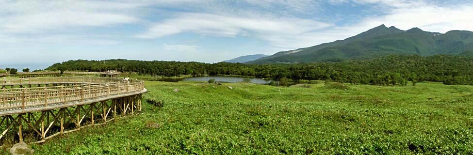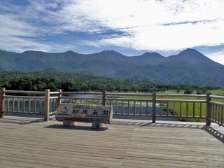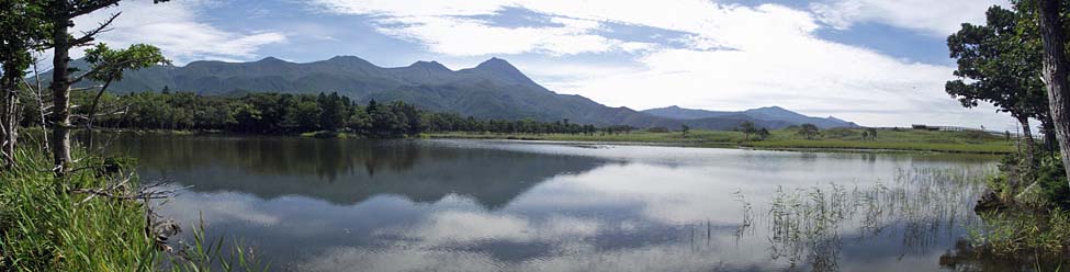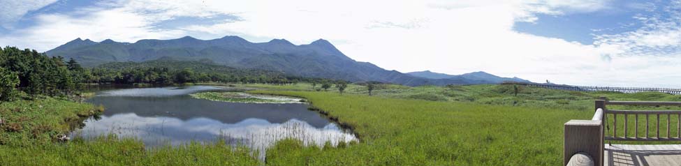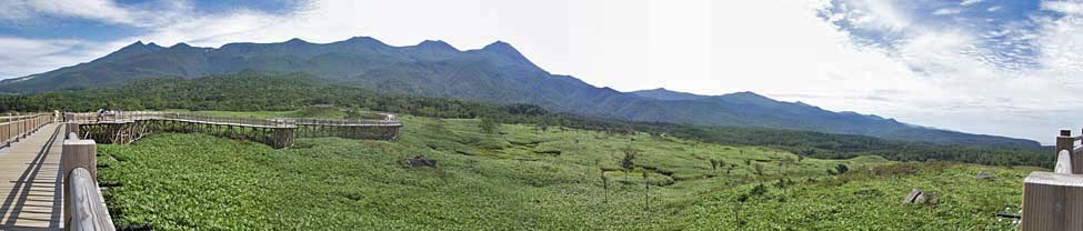 2011/9/9(10:42) 「高架木道」から見る「知床連山」。 「知床連山」の左端は「硫黄山:1,562m」。右端が「羅臼岳(知床冨士):標高1,660m」である。 |