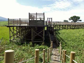 2011/9/9(10:25) 「高架木道」の「湖畔展望台」。 この先「高架木道」へは、一方通行の回転扉の ようにになっており、「地上遊歩道」から「高架 木道」には行けるが、「高架木道」から、「地上 遊歩道」には、降りられないようになっている。 |
