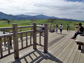 2011/9/9(10:26,10:30) 「高架木道」の「湖畔展望台」。 ここからの景色も素晴らしい。そして、ここまでは、駐車場から「高架木道」を歩いて、 誰でもが無料で来ることができる。 |