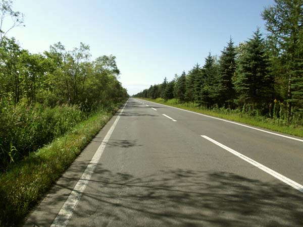 「釧路湿原道路」は、国立公園釧路湿原の南部を横断する道路で、 広域農道釧路東地区として、北海道が整備した農道である。 農道だから狭い?:ご覧の通り、大型トレーラーも「バンバン」走っています。 釧路湿原の中を走るから景色は抜群?:道路に沿って植えられた木のため、 周りはほとんど見えません。ただし、道を横にそれると、開放感のある 景色が広がるのだが、その道は地図にも載らないような道であり、 車で入り込むのは、お勧めできない。