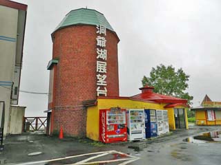 「洞爺湖展望台」とあるので、サイロの中は展望台になっているのかと近寄ると、入口には「添乗員・乗務員様 専用の休憩室です。一般の方はご遠慮下さい」とあり、展望台は建物の裏にある。 |