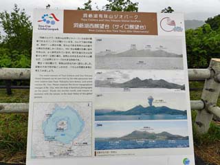 「洞爺湖西展望台(サイロ展望台)」の案内板。 案内板には、過去の噴火により「有珠山」の形が 変化する様子が写真で紹介されている。
