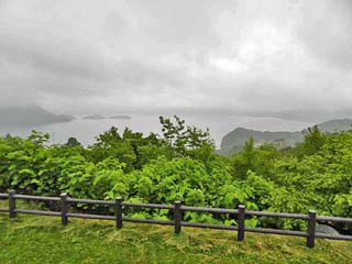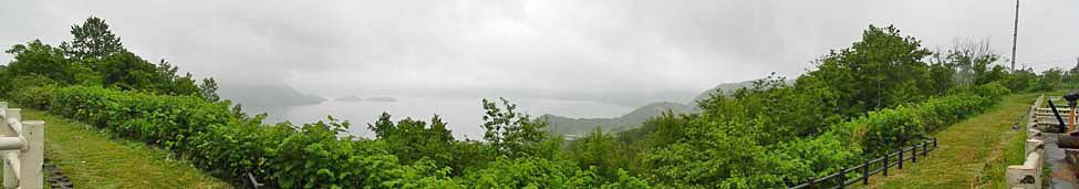 あいにくの天候であったが、「洞爺湖」と洞爺湖に浮かぶ「中島」、「観音島」、「弁天島」が見えている。