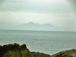 2011/9/9(14:01) 「天狗岩」から6.6倍ズームで見る「国後島」。 見えている山は左が「羅臼山:標高888m」。 右が「小羅臼山:標高800m」。 「天狗岩」から「羅臼山」までの距離は、 約44.4km。「国後島」の一番近い陸地まで は、30km弱である。