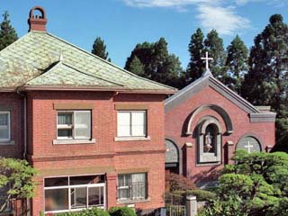 写真右、教会風の建物の壁には「慈しみの聖母 マリア像」が立つ。 これが、現在、「天使園」の向かいにあり、 「マリー・ベルナルド神父」の作品という「慈しみの 聖母マリア像」なのかについては、不明である。 写真をクリックすると、この写真に写る「慈しみの聖母 マリア像」が表示(450x600)されます。 |