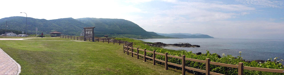 2010/6/30(14:30) 「ウスタイベ岬」北側の景色。 冬は、右に見える海が、流氷に覆われ大氷原に変わり、その流氷の下には「クリオネ」の姿も見ることができるという。 |