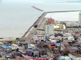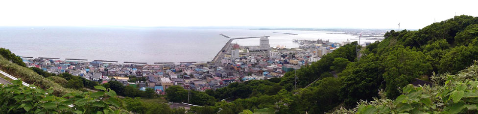 | 2010/6/30(10:51) 「稚内公園」から、市内方面に少し下ったところで見る「稚内市街中心部」と「稚内港」。 |