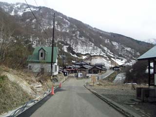 左の写真奥に小さく写る、木造の家並みが、泥湯の温泉街で、ここに3軒の旅館がある。