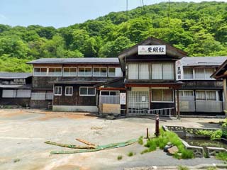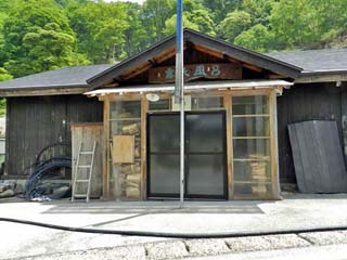 左に「どろゆ食堂」。右に「小椋旅館」。 「どろゆ食堂」の看板には、「稲庭うどん、ラーメン、 山菜」とあるが、この日は休業のようであった。 |