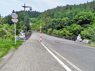 「三途川橋」。 橋の両端には4体の石像が鎮座する。 写真は「栗駒」側の「延命地蔵(左)」と「合掌地蔵(右)」。