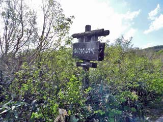 「まんじゅうふかし」入口に立つ標識と標識を西に入った「まんじゅうふかし」への道。