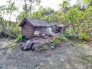 「まんじゅうふかし」。 「四阿」の下にベンチが2つ並ぶだけである。料金を取るような施設も人もいない(つまり無料)。