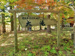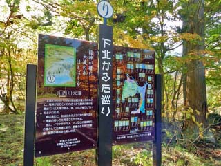 2017/10/19(9:18,9:27) 大滝休憩所に立つ「下北かるた巡り」の案内板と「大滝小公園」から見る「大滝」。